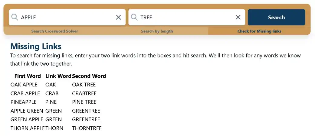 In this example, we were looking for a connecting word between APPLE and TREE. Our missing links generator shows you possible solutions directly. All link words given connect both words and form new words from them.